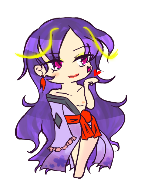 身体特徴とか:黒っくろ、リボン付き忍び服、腹だけだす、ほどよく乳